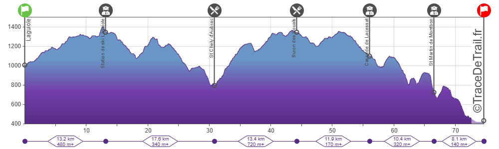 Au départ de Laguiole, vous partirez avec les coureurs du trail du Capuchadou pour vous séparer après le Puech du Roussillon au kilomètre 13.5 (Buron de la Paouade). Vous quitterez les plateaux pour traverser des forêts domaniales avec différents points de vue sur le département de l'Aveyron. A St Chély d'Aubrac (800m), il vous faudra remonter via le chemin de St Jacques de Compostel jusqu'au Truques d'Aubrac (1427m) pour pouvoir prétendre à déguster le célèbre ravitaillement du Buron des Bouals.